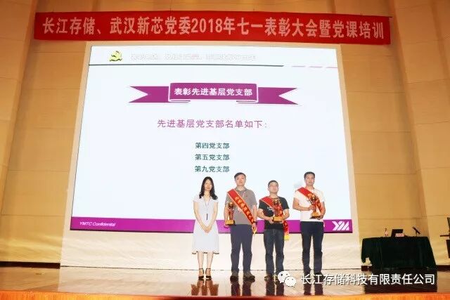 表彰大会由长江存储党委副书记、武汉新芯党委书记杨道虹同志主持。大会在庄严的国歌声中开始,30名“优秀党员”、8名“优秀党务工作者”以及3个“先进基层党支部”先后登台领奖,东湖高新区党工委组织部副部长、招才局副局长曾玉梅及长江存储党委委员、武汉新芯党委委员分别为获奖的先进集体和个人颁发了奖牌和奖杯。
